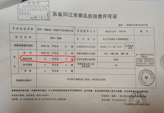 近日有业主反应,广东省阳江市海陵岛保利•银滩H区(玉露天街)这家房地产公司把“住宅”硬是宣传成了“商业街旺铺”,从而让原本住宅均价8000元/平的商品房卖到了25000元/平,整整翻了三倍有余!